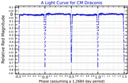 CM Draconis (GJ 630.1A) is an eclipsing binary system approximately 47 light-years away[2] in the constellation of Draco (the Dragon). The system consists of two nearly identical red dwarf stars located in the constellation Draco. The two stars orbit each other with a period of 1.27 days with a separation of 2.7 million kilometres (0.018 AU).[4] Along with two stars in the triple system KOI 126, the stars in CM Draconis are the lightest stars with precisely measured masses and radii. Consequently, the system plays an important role in testing stellar structure models for very low mass stars.[5] These comparisons find that models underpredict the stellar radii by approximately 5%. This is attributed to consequences of the stars' strong magnetic activity.