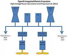 A system which uses both diesel engines and gas turbines to generate electricity for electric motors, where there is no mechanical transmission from either to the propellers, is not classified as CODLAG, but as integrated electric propulsion (IEP) or integrated full electric propulsion (IFEP). Such an arrangement is in use on passenger ships like RMS Queen Mary 2, with a pool of diesel generators for the base load and turbo generators for peak power, and on warships such as the Royal Navy's Type 45 destroyer and the Zumwalt-class destroyer (DDG-1000/DD(X)).