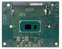The computer-on-module for high performance compute (COM-HPC) form factor standard targets high I/O and computer performance levels. Each COM-HPC module integrates core CPU and memory functionality and input and output including USB up to Gen 4, audio (MIPI SoundWire, I2S and DMIC), graphics, (PCI Express) up to Gen. 5, and Ethernet up to 25 Gbits/s per lane. All I/O signals are mapped to two high density, high speed and low profile connectors on the bottom side of the module. COM-HPC employs a mezzanine-based approach. The COM modules plug into a carrier or base board that is typically customized to the application. Over time, the COM-HPC mezzanine modules can be upgraded to newer, backwards-compatible versions. COM-HPC targets Industrial, Military/Aerospace, Gaming, Medical, Transportation, IoT, and General Computing embedded applications and even scales up to RAM and performance hungry server or edge server applications.