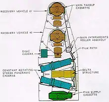 The cameras were manufactured by the Itek Corporation.[35] A 12 in (30 cm), f/5 triplet lens was designed for the cameras.[36] Each lens was 7 in (18 cm) in diameter.[30] They were quite similar to the Tessar lenses developed in Germany by Carl Zeiss AG.[37] The cameras themselves were initially 5 ft (1.5 m) long, but later extended to 9 ft (2.7 m) in length.[38] Beginning with the KH-4 satellites, these lenses were replaced with Petzval f/3.5 lens.[34] The lenses were panoramic, and moved through a 70° arc perpendicular to the direction of the orbit.[30] A panoramic lens was chosen because it could obtain a wider image. Although the best resolution was only obtained in the center of the image, this could be overcome by having the camera sweep automatically ("reciprocate") back and forth across 70° of arc.[39] The lens on the camera was constantly rotating, to counteract the blurring effect of the satellite moving over the planet.[34]