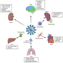 The virus can cause acute myocardial injury and chronic damage to the cardiovascular system.[128][129] An acute cardiac injury was found in 12% of infected people admitted to the hospital in Wuhan, China,[130] and is more frequent in severe disease.[131] Rates of cardiovascular symptoms are high, owing to the systemic inflammatory response and immune system disorders during disease progression, but acute myocardial injuries may also be related to ACE2 receptors in the heart.[129] ACE2 receptors are highly expressed in the heart and are involved in heart function.[129][132]