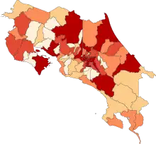 On 15 March, a total of 350 educational centers have been closed down.[23] Three patients were placed in ICU.[24] Health authorities also confirmed cases in the cantons of Santa Ana, Grecia, Nicoya, La Unión, Poás, Pérez Zeledón, San Pablo and Barva.[25]