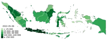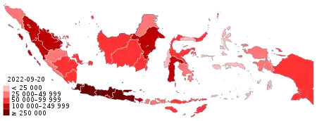 By 9 April 2020, the pandemic had spread to all 34 provinces in the country at that time. Jakarta, West Java, and Central Java are the worst-hit provinces, together accounting more than half of the national total cases. On 13 July 2020, the recoveries exceeded active cases for the first time.[5]