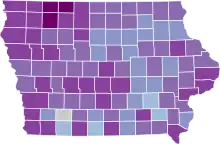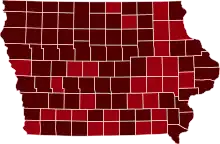 ![]() Map of the outbreak in Iowa by confirmed total infections per 100,000 people (last updated March 2021)