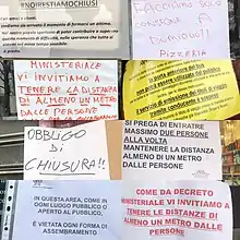 In the night between 7 and 8 March, the government approved a decree to lock down Lombardy and 14 other provinces in Veneto, Emilia-Romagna, Piedmont and Marche, involving more than 16 million people.[136] The decree "absolutely avoided any movement into and out of the areas" and, like the previous one, it provided sanctions of up to three months in prison for those who violated the lockdown.[137] It was possible to move into and out of the areas only for emergencies or "proven working needs", which must be authorised by the prefect.[138] The decree also established the closure of all gyms, swimming pools, spas and wellness centres. Shopping centres had to be closed on weekends, while other commercial activities could remain open if a distance of one metre between customers could be guaranteed.[139] The decree imposed the closure of museums, cultural centres and ski resorts in the lockdown areas and the closure of cinemas, theatres, pubs, dance schools, game rooms, betting rooms and bingo halls, discos and similar places in the entire country.[139] Civil and religious ceremonies, including funeral ceremonies, were suspended. All organised events were also suspended, as well as events in public or private places, including those of a cultural, recreational, sporting and religious nature, even if held in closed places.[140] This measure was described as the largest lockdown in the history of Europe,[141][142] as well as the most aggressive response taken in any region beyond China, and paralysed the wealthiest parts of the country as Italy attempted to constrain the rapid spread of the disease.[143][144]