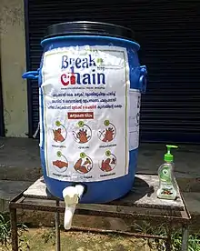 The Kerala government introduced a mass hand washing campaign named break the chain on March 15 to educate people about the importance of public and personal hygiene due to the spread of the novel coronavirus across the state. Health Minister of Kerala, Smt. K. K. Shailaja inaugurated the mass campaign. The government has appealed the public to promote break the chain campaign as a safety measure. During this campaign, the government has installed water taps with hand wash bottles at public spots of the railway stations and other public places.[48][49][50]