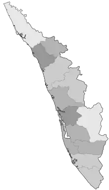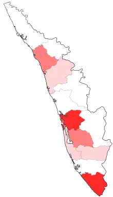 Kerala now has the 2nd highest number of confirmed cases in India after Maharashtra. As of July 2021, more than 90% of known cases were due to community spread. The most number of cases are reported in Ernakulam (13.9%), Thiruvananthapuram (11.1%) and Kozhikode (10.1%) districts (Percentage of confirmed cases out of total confirmed cases in Kerala).[19][20] Cases per million population is highest in Ernakulam (2,85,100+), Kottayam (2,39,000+), Pathanamthitta (2,33,800+) and Thiruvananthapuram (2,27,400+) districts.