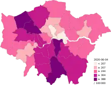 ![]() COVID-19 cases in London per 100,000 population by borough, as of 4 June 2020. | |