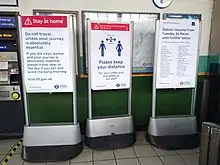 The Waterloo & City line, several tube stations and the Night Tube were suspended on 19 March,[36] with the Mayor of London and Transport for London (TfL) urging people to only use public transport if absolutely essential so that it can be used by critical workers.[37] From 20 March, 40 tube stations were closed.[36] From 25 March, London Underground measures to combat the spread of the virus by slowing the flow of passengers onto platforms included the imposition of queuing at ticket gates and turning off some escalators.[38]