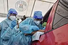 On April 1, the City of Manila reports its largest single-day increase in coronavirus infections so far with 41 new cases, bringing the city's total to 116.[45] In the same day, more than 800 Filipino repatriates from four virus-stricken cruise ships in the U.S. arrive at Ninoy Aquino International Airport.[46] The Inter-Agency Task Force on Emerging Infectious Diseases (IATF-EID) announced on April 2 that Metro Manila remains the worst hit by the coronavirus crisis in the country after 1,511 cases were confirmed in the region, or more than 50 percent of the total confirmed cases in the Philippines by that time.[47] COVID-19 inter-agency taskforce spokesman Karlo Nograles announces the mandatory wearing of face masks in public for residents in all regions under enhanced community quarantine in Luzon.[48] The Department of Health launches a 24/7 coronavirus hotline for Metro Manila residents.[49] On April 6, a ten-man medical team from China arrive in Manila to share their experience in prevention and control of the coronavirus disease,[50] while the Metro Manila Development Authority installed decontamination tents in all public hospitals and government offices across the region.[51] On April 3, the National Capital Region Police Office confirm its first COVID-19 casualty among its ranks.[52]