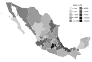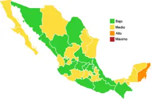 ![]() Map of the outbreak in Mexico by increase or decrease of confirmed new infections per week (as of August 11; week 31) | |