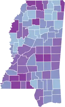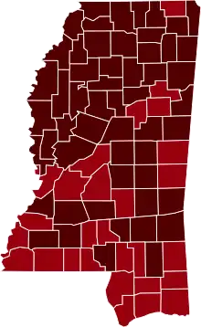 ![]() Map of the outbreak in Mississippi by confirmed total infections per 100,000 people (last updated March 2021)