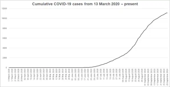 As of September 2020, Namibia was within the top 18 number of countries with the most COVID-19 cases reported in Africa. Although Erongo lead with the most cases and deaths, Khomas region started to experience a community outbreak and numbers rose exponentially to match that of Erongo. In mid-September, most restrictions were lifted after a significant decrease in daily cases.