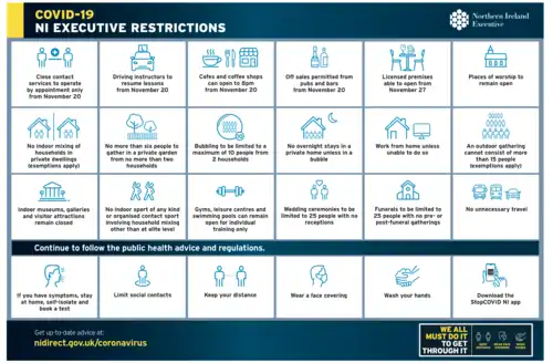 - "Coronavirus (COVID-19): regulations, guidance and what they mean for you". NI government. Archived from the original on 17 July 2020. Retrieved 17 July 2020.