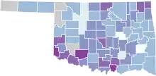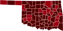 ![]() Map of the outbreak in Oklahoma by confirmed total infections per 100,000 people (last updated March 2021)