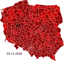 On 14 October Sebastian Kaleta tested positive for SARS-CoV-2.[40] On 24 October, it was announced that Polish president Andrzej Duda had tested positive for COVID-19 after attending an event in Tallinn where he met Bulgarian president Rumen Radev who had gone into self-isolation after the event.[41] On 2 December 2020, Poland reached 1 million cases.