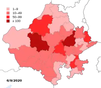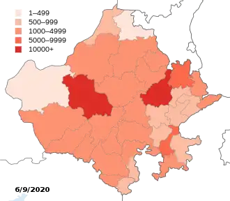 The first case of the COVID-19 pandemic in the Indian state of Rajasthan was reported on 2 March 2020 in Jaipur.[2] The Rajasthan Health Department has confirmed a total of 29,835 cases, including 563 deaths and 21866 recoveries as of 20 July 2020.[1] All districts in the state have reported confirmed cases of which, Jaipur is the worst-affected.[1][3]