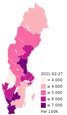 ![]() Map of confirmed cases in Sweden (per 100,000 residents)[1] | |
