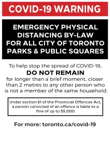 On Saturday, May 23, 2020, due to warmer weather, estimates of up to 10,000 mostly young people gathered in Trinity Bellwoods Park.[28] Public outrage ensued as well as condemnation from Premier Ford and Toronto's medical officer of health Eileen de Villa.[29][30] After making a tour of the city's parks and speaking with citizens, Mayor John Tory was criticized for lack of social distancing and improperly wearing a mask.[31] He publicly apologized for his actions to following day.[31] No social distancing fines were placed, however, there were several issued for public urination.[32] Police presence was increased the following day to prevent any subsequent large gatherings.[33] The following week, 'social distancing circles' were painted on the lawn in the park modelled after similar tactics used in San Francisco and New York City.[34][35][36][37][38]
