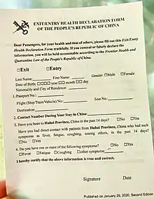 - "出入境健康申报指引". 中央广播电视总台国际在线. 30 January 2020. Retrieved 31 January 2020.