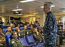After several weeks in the eastern Mediterranean, Charles de Gaulle proceeded to the Atlantic and North Sea for naval exercises alongside her battle group, which consisted of the air-defense frigate Chevalier Paul, the anti-submarine frigate La Motte-Picquet, the command and replenishment ship French tanker Somme, and a nuclear-powered submarine.[9] From 13 to 15 March, Charles de Gaulle was docked in Brest for a brief port visit. The enactment of a strict lockdown to combat the ongoing coronavirus pandemic came two days after the ship left Brest, and the sailors were allowed shore leave that included seeing family members and visiting local commercial establishments.[7][10] Charles de Gaulle's crew did not have contact with the outside world for the next three weeks.[11] Belgium's frigate Leopold I, part of the carrier battle group, was ordered to prepare to leave the force on 24 March after detecting a single coronavirus case.[12] The nature of warships, which includes working with others in small enclosed areas and a lack of private quarters for the vast majority of crew, lent themselves to the rapid spread of the disease to a degree even greater than that seen on cruise ships.[13] Indeed, on Charles de Gaulle there were places where 20 people would sleep together on three or four floors of berths.[14]