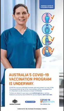 The general COVID-19 vaccination in Australia program began on 22 February 2021 in response to the COVID-19 pandemic, with the goal of vaccinating all willing people in Australia before 2022. Front-line workers[lower-alpha 1] and aged care staff and residents had priority for being inoculated, before a gradual phased release to less-vulnerable and lower-risk population groups throughout 2021. The Therapeutic Goods Administration (TGA) approved four vaccines for Australian use in 2021: the Pfizer–BioNTech vaccine on 25 January, the Oxford–AstraZeneca vaccine on 16 February, Janssen vaccine on 25 June and the Moderna vaccine on 9 August.[4][5][6][7] Although approved for use, the Janssen vaccine was not included in the Australian vaccination program as of June 2021.[8]