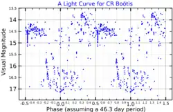 ![]() A visual band light curve for CR Boötis, plotted from 2019 AAVSO data.[1] The data have been folded with the supercycle period found by Kato et al.[2] | |