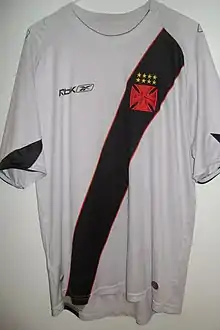 Vasco currently has three kits. The home shirt's main color is black with a white sash. The short and the socks are black. The away kit is similar to the home kit, but the main color is white, the sash is black, and the shorts and socks are white. In 2009–10 the third kit was all white, with a red "cross of the Knights Templar". In 2010, the away kit changed to black in honor of 1923's team, which gave up playing for having black players, which were not allowed to play with white players at that time.