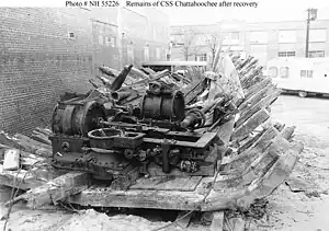 Chattahoochee lay underwater until 1963, when her sunken remains were found within the boundaries of Fort Benning. They later were raised and a portion of her hull and her original steam engines once more returned to her home in Columbus, where they were placed on display at the National Civil War Naval Museum.[13] Because she was scuttled and lay submerged for a century, Chattahoochee is the only Confederate Navy gunboat that survived to the modern era.[14]