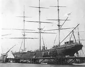 The ship had three names and many owners in her lifetime of nine years. She was designed as an auxiliary composite passenger cargo ship of 1,018 tons and built in 1863 by Alexander Stephen & Sons, Glasgow, Scotland, for Robertson & Co., Glasgow, to be named Sea King. The ship was intended for the East Asia tea trade and as a troop transport. While she was being fitted out at the builders, US representatives assessed the ship for purchase.[4] After change of owner and a number of trips to the Far East carrying cargo and to New Zealand transporting troops to the New Zealand Wars, the Confederate navy assessed and purchased her from Wallace Bros of Liverpool. The purchase was made in secret; it was completed on 18 October 1864, and the next day the ship was renamed CSS Shenandoah. The ship was to be converted into an armed cruiser with a mission to capture and destroy Union merchant ships. Liverpool was the unofficial home port of the Confederate overseas fleet, and Confederate Commander James Dunwoody Bulloch was based in the city. The city provided ships, crews, munitions, and provisions of war.[5]
