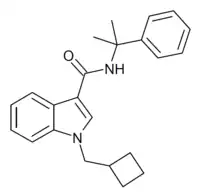 CUMYL-CBMICA (SGT-280) is an indole-3-carboxamide based synthetic cannabinoid receptor agonist which has been sold as a designer drug,[1][2] first being identified in Germany in August 2019. Since the structure fell outside the German drug analogue law provisions at the time, an amendment was made to the law to expand the relevant definition, which came into effect in April 2020.[3] It has been shown to act as a CB1 receptor agonist with an EC50 of 62.9nM.[4]