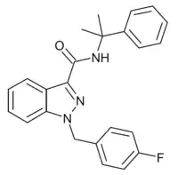 CUMYL-FUBINACA (SGT-149) is an indazole-3-carboxamide based synthetic cannabinoid receptor agonist, with an EC50 of 1.8nM for human CB1 receptors and 23.7nM for human CB2 receptors, giving it around 13x selectivity for CB1.[1][2][3][4] It has been sold online as a designer drug.[5]