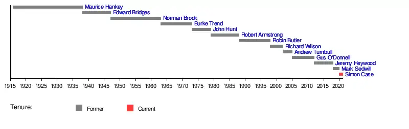 The position of Cabinet Secretary was created in 1916 for Sir Maurice Hankey, when the existing secretariat of the Committee of Imperial Defence, headed by Hankey, became secretariat to a newly organised War Cabinet.[2]