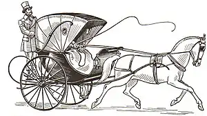 A cabriolet is a light horse-drawn vehicle, with two wheels and a single horse. The carriage has a folding hood that can cover its two occupants, one of whom is the driver. It has a large rigid apron, upward-curving shafts, and usually a rear platform between the C springs for a groom. The design was developed in France in the eighteenth century and quickly replaced the heavier hackney carriage as the vehicle for hire of choice in Paris and London.