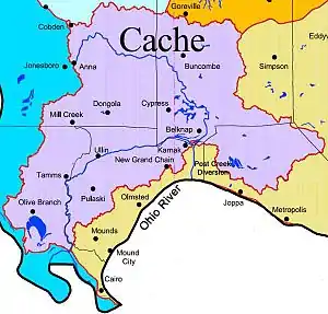 In 1950, about 11 miles (18 km) north of the Cache's natural mouth at the Ohio River, a diversion channel was created to connect the Cache and Mississippi rivers. Those last 11 miles (18 km) of the Cache continue to drain into the Ohio through the original channel.[3]
