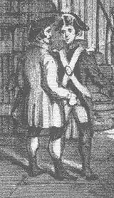 Writing in the middle of the 18th century, the first historian of Edinburgh, William Maitland, described "cadees" as "errand-men, news-cryers or pamphlet-sellers" existing before 1714.[5] As of that date they became an organised society subject to regulation and supervision by the Town Council, which was responsible for upholding the monopoly of its members' activities within the city. Magistrates on the Council determined the number of members, each of whom was issued with an "apron of blue linnen" to be worn as a badge of identification "which none may lend, on pain of losing his privilege".[6] On joining the Company each new member paid a deposit of 10 pounds Scots, as a surety for honesty and good behaviour, and the sum of 14 shillings and 6 pennies Scots into the "Company's Box". Members also had to pay a fixed amount of 6 pennies Scots after selling each new edition of newspapers and pamphlets. They were fined for transgressions of the company's rules, as well as incivilities such as drunkenness and gambling. Rule 3 laid down obligations for moral conduct to the effect that "Every one of the Company shall behave himself decently, and shall not use any unbecoming language to one another, much less to any other person, neither shall they curse or swear by faith, conscience, or the like, much less profane the Lord's name, or break the Sabbath-day; but shall go to church every Lord's Day, and therein behave themselves discreetly during Divine worship." Those who were illiterate were expected to attend school for one day each week to learn to read and write. Slovenly appearance, lodging disreputably and "fighting with any, beating his neighbour, or keeping a correspondence with thieves, pickpockets or debauched persons" were grounds for expulsion. [6]