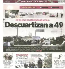 The Cadereyta Jiménez massacre occurred on the Fed 40 on 12–13 May 2012.[1] Mexican officials stated that 49 people were decapitated and mutilated by members of Los Zetas drug cartel and dumped by a roadside near the city of Monterrey in northern Mexico.[2][3] The Blog del Narco, a blog that documents events and people of the Mexican Drug War anonymously, reported that the actual (unofficial) death toll may be more than 68 people.[4] The bodies were found in the town of San Juan in the municipality of Cadereyta Jiménez, Nuevo León at about 4 a.m. on a non-toll highway leading to Reynosa, Tamaulipas.[5][6] The forty-three men and six women killed had their heads, feet, and hands cut off, making their identification difficult.[2] Those killed also bore signs of torture and were stuffed in plastic bags.[7] The arrested suspects have indicated that the victims were Gulf Cartel members,[8] but the Mexican authorities have not ruled out the possibility that they were U.S.-bound migrants.[9] Four days before this incident, 18 people were found decapitated and dismembered near Mexico's second largest city, Guadalajara.[10]