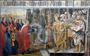 In 688 Cædwalla abdicated and went on a pilgrimage to Rome, possibly because he was dying of the wounds he had suffered while fighting on the Isle of Wight.[4] Cædwalla had not been baptised, and Bede states that he wished to "obtain the particular privilege of receiving the cleansing of baptism at the shrine of the blessed Apostles". He stopped in Francia at Samer, near Calais, where he gave money for the foundation of a church, and is also recorded at the court of Cunincpert, king of the Lombards, in what is now northern Italy.[33] In Rome, he was baptised by Pope Sergius I on the Saturday before Easter (according to Bede) taking the baptismal name Peter, and died not long afterwards, "still in his white garments". He was buried in St. Peter's church. Bede's Ecclesiastical History and the Anglo-Saxon Chronicle agree that Cædwalla died on 20 April, but the latter says that he died seven days after his baptism, although the Saturday before Easter was on 10 April that year. The epitaph on his tomb described him as "King of the Saxons".[9][34]