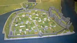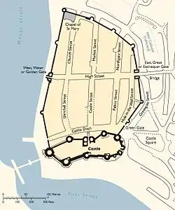 Traditionally Caernarfon's design and defences have been thought to have been inspired by the growth of the bastides. The bastides were new planned towns created in both France and English-held Gascony during the period, characterised by grids of straight streets, often defended by combinations of castles and town walls.[9] More recent research, however, has shown that English town design played a more significant role in shaping Caernarfon and other Edwardian town plans.[10] In the case of Caernarfon, the town plan and walls were adapted to fit around the site of the former Norman castle on the site, which lay just outside the new town and was used a market place.[11][nb 1]