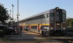 The first generation of these Bi-Level intercity cars was dubbed the "California Car"[2] and incorporated numerous innovative features specified for California's intercity services. These include two large entry vestibules for high-volume passenger loading and unloading, two automatically controlled door pairs per side, an on-board wheelchair lift, two straight staircases, bicycle storage, large workstation tables, a food service car with an elevator to move food and other supplies to the sales counter on the upper level, center aisles of width compliant with the Americans with Disabilities Act, and control cab cars to allow for push-pull operation.[2] Caltrans awarded the $155 million contract to build the California Cars to Morrison–Knudsen in February 1992.[3] Morrison–Knudsen would later spin off it transit car manufacturing unit as the American Passenger Rail Car Company, or Amerail, in October 1995, which would complete the order.[4][5]
