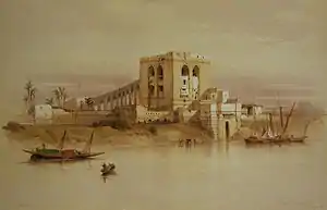 The intake tower was located on the shore of the Nile in the area now known as Fumm al-Khalig, north of Fustat (or "Old Cairo" today) and further north than the Ayyubid-era wall and canal.[3][2] The intake tower is hexagonal and featured four waterwheels (saaqiyyas) which raised water to the top of the tower, from where it flowed along a set of channels along the aqueduct. Along the way, al-Nasir built another tower with three more waterwheels raising the water to an even higher level, after which it continued to run along an aqueduct until it reached the foot of the citadel, at which point it was yet again raised by waterwheels in another tower.[2] From this last tower the water then entered into the Citadel and into a reservoir known as the Bi'r al-Sa'b Sawaqi ("Well of the Seven Waterwheels"), inside the Citadel's Southern Enclosure (near the harem area) and southwest of the famous Spiral Well of Salah ad-Din.[2] From this reservoir, water was distributed by an underground network to the rest of the buildings in the Citadel.[2] The aqueduct itself consisted of a channel carried along the top of large stone piers and arches, which ran for about one-and-a-half kilometers due east before turning northeast, and after half a kilometer the aqueduct then joins the old canal which was constructed along the top of Salah ad-Din's city wall.[4] This new system increased the amount of water brought to the Citadel, allowing al-Nasir Muhammad to carry out his major building projects in the Citadel, such as his mosque and the great palace known as the Qasr al-Ablaq ("Striped Palace").[3]