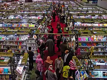 The fair is also notable as Cairo-based publishers produce an estimated three of five Arabic language books printed in the world,[5] and the state owned General Egyptian Book Organisation—who coordinate the fair—is the largest book publisher in the Arab world.[5] The fair features booths and speakers from private publishers and government agencies from around the world, as well as retailers of books, video, and other media.[6][7] Lectures, readings, and other public events take place during the almost three weeks over which the book fair runs, and material is presented in Arabic, English, and other languages. The fair purposely appeals to ordinary Egyptians, with media on mainstream topics, outdoor events, and even fireworks to entertain the large crowds.[8]