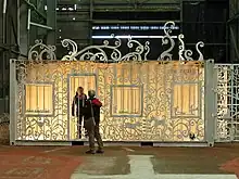 Cal Lane uses a plasma cutter or an oxy-acetylene torch to cut intricate patterns into industrial steel products.[4]