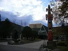 The Cal Neva Lodge and Casino overlooks Lake Tahoe with the property split across the California–Nevada border near Crystal Bay.[55][64] The main dining room has a white line indicating the state border running down the middle of the room.[65] The swimming pool also straddles the state border.[25] The interior is decorated in the lodge-style.[66] The entrance has been replaced several times over the years, although the exterior of the buildings have remained almost the same since the reconstruction.[67] Prior to the expansion under Sinatra, the lodge had 55 rooms and 11 lodges,[66] but this was increased to 220 lake-facing rooms following the expansion in 1969.[46][68] As of 1998, it had 182 rooms and suites and eight conference rooms, catering for up to 400 people.[57]