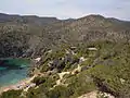 The beach of Cala d’en Serra is a small horseshoe bay with a further satellite coves near by. The sandy beach has clean clear water[2] and was once named in The Guardian newspaper, one of Europe’s best beaches.[3] The bay is surrounded by steep cliffs.[3]