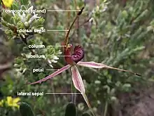 A single flower (rarely two) is borne on a spike up to 22 cm (9 in) high. The dorsal sepal is erect, oblong to lance-shaped, 30–37 mm (1.2–1.5 in) long and about 3 mm (0.1 in) wide. It tapers near the end which terminates in a glandular structure 6.5–9 mm (0.3–0.4 in) long. The lateral sepals are oblong to lance-shaped, 30–37 mm (1.2–1.5 in) long, 4–5 mm (0.16–0.20 in) wide and end in a gland similar to the one on the dorsal sepal. The petals are 28–32 mm (1.1–1.3 in) long, 2–3 mm (0.08–0.1 in) wide and taper to a point. The labellum is a broad egg-shape, curves forward, 14–16 mm (0.55–0.63 in) long and 10–12 mm (0.4–0.5 in) wide when flattened. The labellum is cream-coloured with red veins and a dark red tip, sometimes entirely red. There are 9 to 12 pairs of calli along the edge of the labellum, decreasing in length towards its front. There are four rows of foot-shaped calli in the centre of the labellum, also smaller towards the tip. Flowering occurs in September and October.[3]