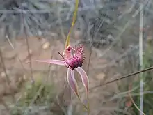 Up to three red, yellow and green flowers are borne on a stalk 25–50 cm (10–20 in) tall. The flowers are 6–15 mm (0.2–0.6 in) long and 5–10 mm (0.2–0.4 in) wide, making them one of the largest among Western Australian spider orchids. The bases of the sepals and petals are linear to lance-shaped and held stiffly for about one-third, then suddenly narrow. The dorsal sepal is erect, linear to lance-shaped, 4.5–7 cm (2–3 in) long and 3–6 mm (0.1–0.2 in) wide at the base with a yellow-brown glandular tip up to 25 mm (1 in) long. The lateral sepals are spreading and downcurved, 5–8 cm (2–3 in) long and 3.5–8 mm (0.1–0.3 in) wide at the base with a tip similar to the one on the dorsal sepal. The petals are 4–6 cm (2–2 in) long and 3.5–5 mm (0.1–0.2 in) wide at the base, slightly ascending then slightly curved downwards and sometime lack glandular tips. The labellum is dark pink with red stripes and ends in a dark tip. It is linear to heart-shaped, 20–28 mm (0.8–1 in) long and 13–20 mm (0.5–0.8 in) wide and curves downward at the front. The sides curve upwards and have a fringe of narrow teeth up to 9 mm (0.4 in) long but suddenly decreasing in length about half-way towards the tip of the labellum. There are four rows of pale maroon, golf stick-shaped calli in the centre of the labellum for at least three-quarters of its length, but decreasing in size towards its tip. Flowering occurs from mid-August to October.[2][3][4]