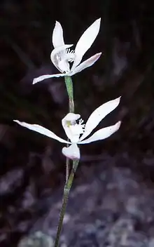 Caladenia dimorpha, commonly known as spicy caps,[3] is a plant in the orchid family Orchidaceae and is endemic to New South Wales. It is an uncommon ground orchid with a single sparsely hairy leaf, and up to three white flowers which often have pinkish markings.