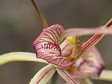 Caladenia doutchiae, commonly known as the purple-veined clown orchid[2] or purple-veined spider orchid[3] is a species of orchid endemic to the south-west of Western Australia. It has a single hairy leaf and usually only one greenish-yellow and red flower with short, downswept petals, and lateral sepals that are broad at the base then narrow to a glandular tip.