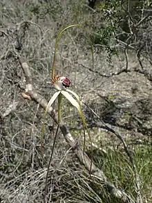 The giant spider orchid is found between Dunsborough and Karridale in the Jarrah Forest and Warren biogeographic regions where it grows in forests in deep sandy soils.[2][3][4][6]